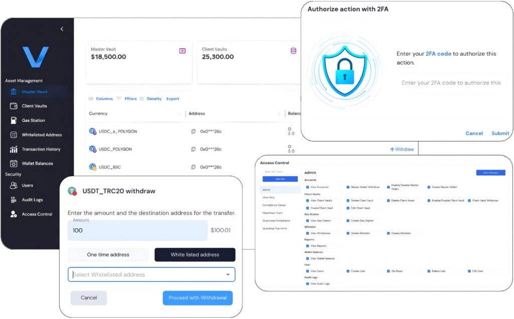 B2Vault’s advanced Policy Engine provides granular access control, allowing you to define rules for transactions, user actions, and whitelisted addresses. You can set approval workflows, assign user roles, and specify parameters such as amount, destination, and asset type, ensuring that funds are moved only according to the rules you establish.